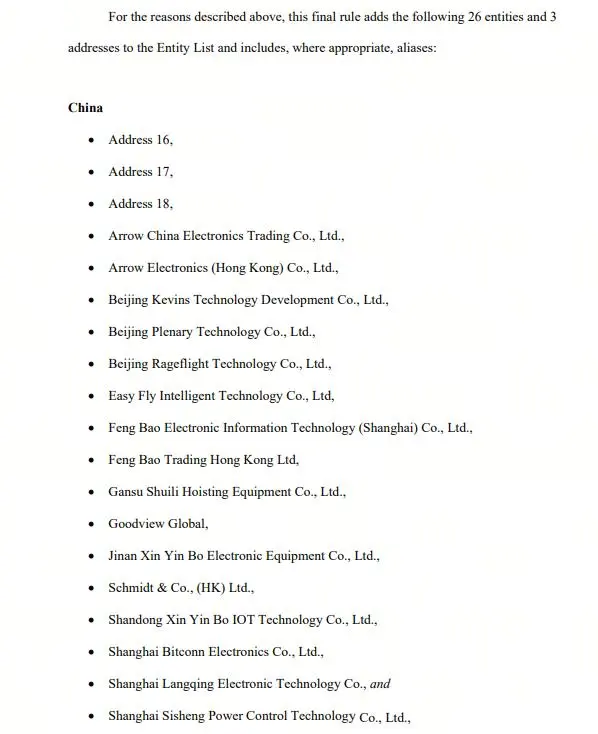 10月8日,美国商务部工业与安全局(BIS)再次把26家实体+3个地址新增进实体清单,艾睿中国(Arrow China)与艾睿香港赫然在列。官方理由是:这两家公司 “涉嫌把美制电子元器件导流进特定无人机供应链”。